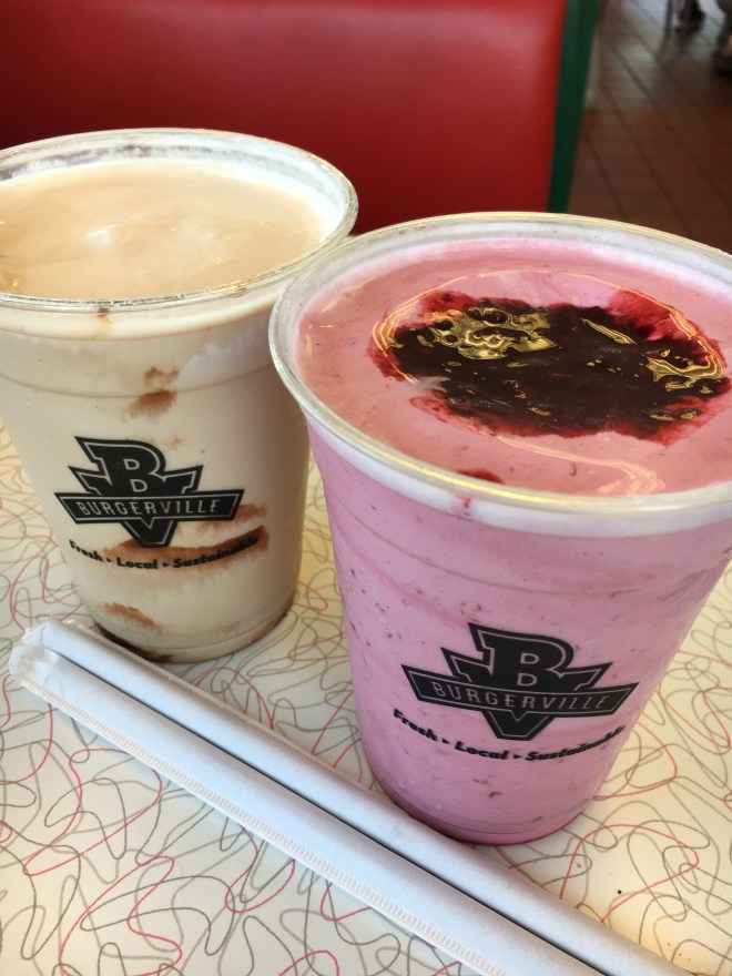 We drove from Wenatchee, WA to Bend, OR, and travelled via The Dalles, so that we could stop at the Burgerville for lunch…because…BLISS SHAKES! {As in, Coconut Bliss!} Eric tried the mocha flavor and I tried the Oregon Marionberry flavor. YUM! You can get other flavors, too (They had an impressive adzuki bean burger as well– just hold the cheese and mayo). The onion rings are immense!