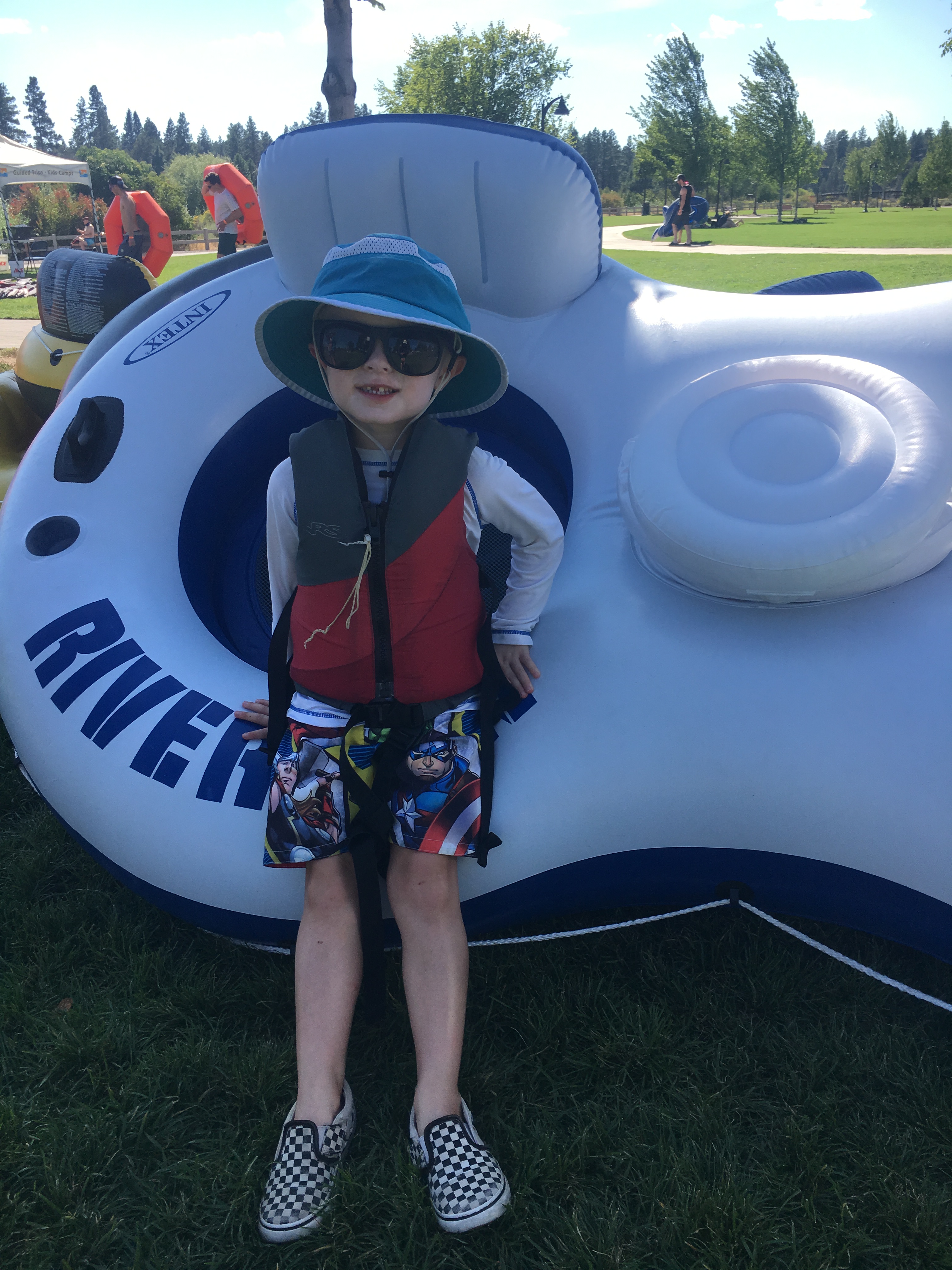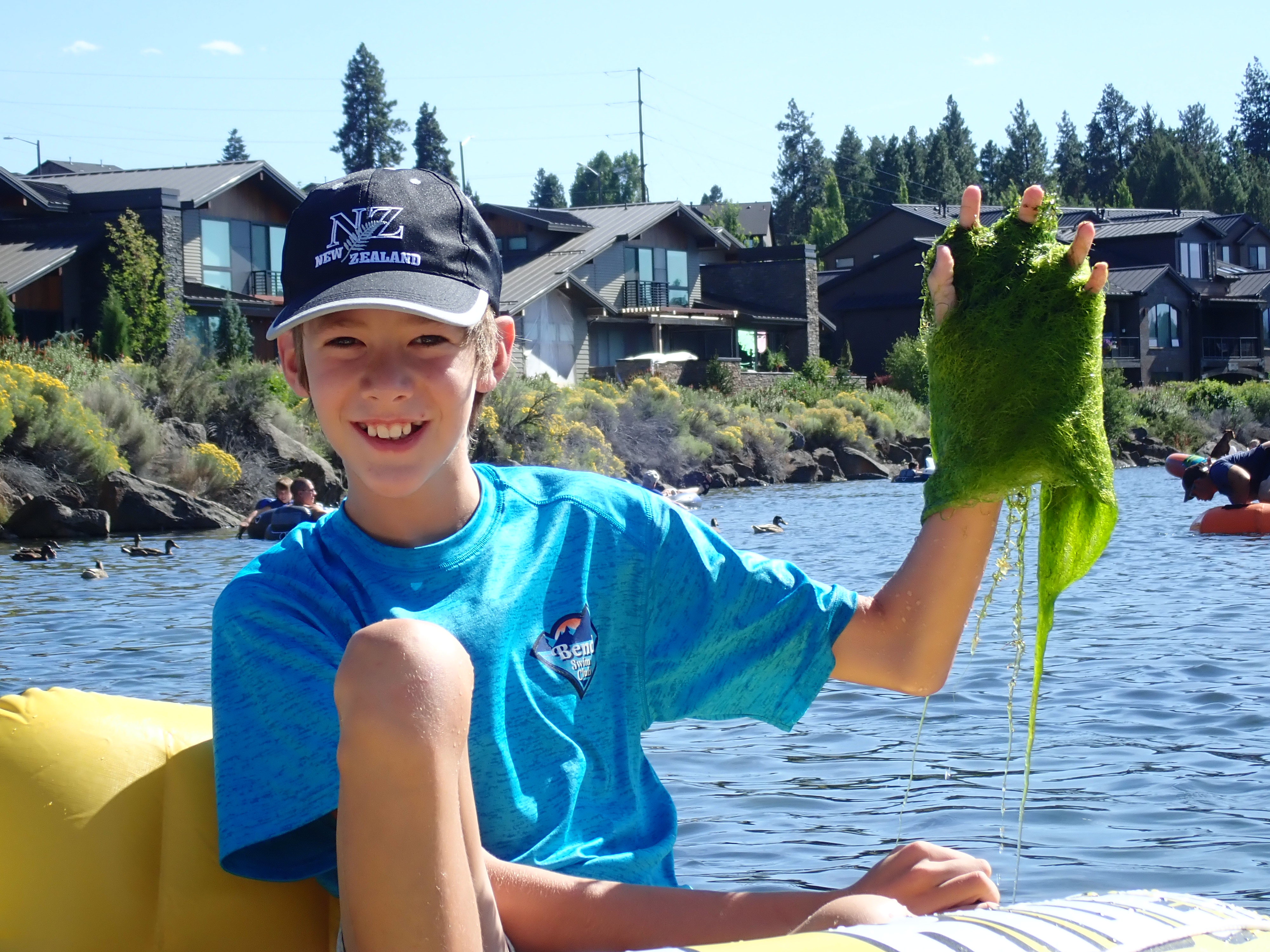 [When we woke up in the morning, Todd said this was a special day for us because we were going to take a boat to South America. And– this coincided perfectly with our plans to float the river in the afternoon. The back story is that we’d been reading library books about apex predators of the Amazon rainforest. I’d explained to Todd that you’d take either an airplane or a boat it you wanted to go there. Then– after we got home from this trip to Bend Todd said, “Next time from when we go on the river, we have to go much, much farther, so we can go to South America.”]