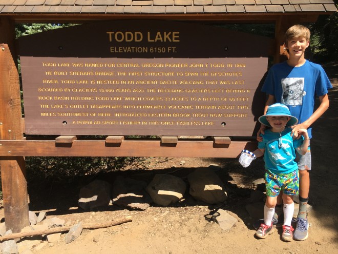 “Todd Lake was named for central Oregon pioneer John Y. Todd. In 1860 he built Sherars Bridge, the first structure to span the Deschutes River. Todd Lake is nestled in an ancient dacite volcano that was last scoured by glaciers 18,000 years ago. The receding glaciers left behind a rock basin holding Todd Lake which covers 33 acres to a depth of 60 feet. The lake’s outlet disappears into permeable volcanic terrain about two miles southwest of here. Introduced Eastern Brook trout now support a popular sport fishery in this once fishless lake.”