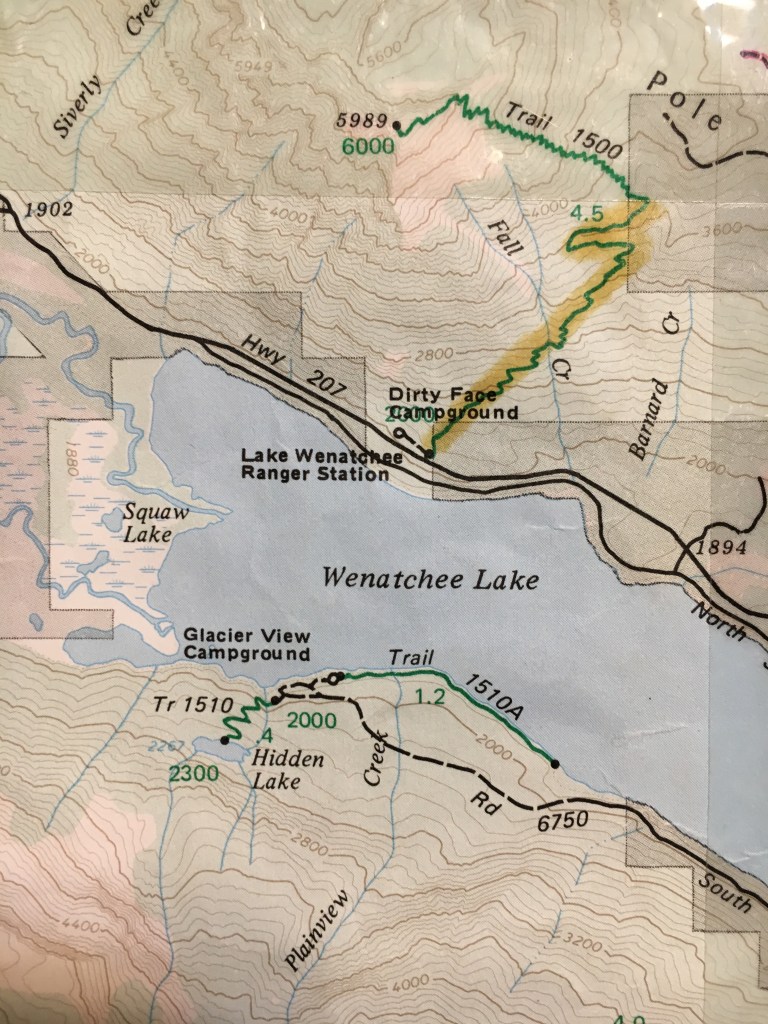 Here’s a view of Dirty Face Peak. Eric and I did that hike waaaay back in October of 2003! [The map at the top of this post shows the trail on the Green Trails map. I couldn’t highlight over the tape, but we did complete the whole hike!]