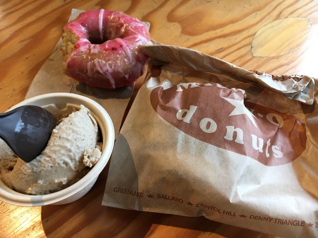 We drove to Seattle in the early afternoon, and stopped for an early dinner at No Bones Beach Club (Ballard, WA). We had to wait a little while to get a table (this vegan restaurant is very popular, but its seating capacity isn’t very high), so we slipped into Mighty-O Donuts for vegan donuts. Mighty-O shares the interior space with Sweet Alchemy, so I sprung for a scoop of vegan ice cream, too!