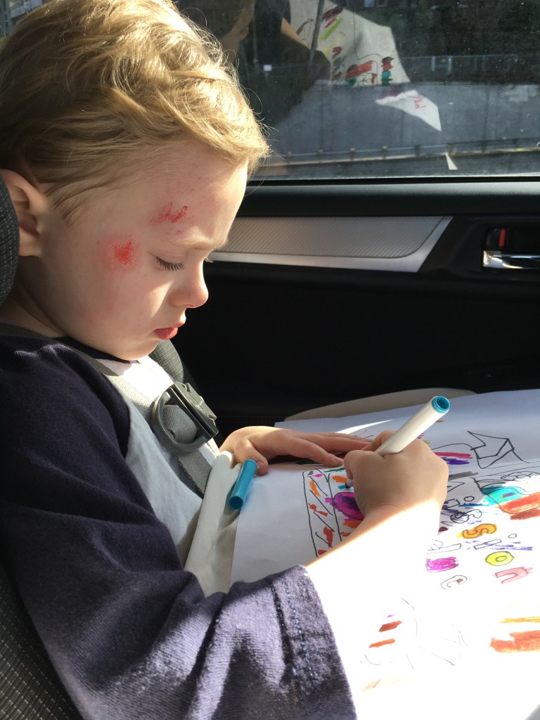 Todd ran on the sidewalk, toward the car, with his hands in his pockets. Splat! Ouch! Fortunately, the wound was pretty superficial. He fell asleep shortly after this picture was taken, and was basically fine after he woke up. He admitted that he learned a “hard lesson”!