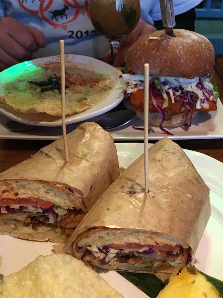 At No Bones Beach Club, I ordered a very spicy margarita. {Something I wouldn’t necessarily repeat!} Eric ordered a refreshing beverage (a mojito?) and the Buffalo Tempeh Sando. We split the Coastal Chowder, which was excellent! {I took a picture of Eric’s food and a sandwich that I didn’t order. After I photographed it and started to dive in, I realized the mistake! It was (unfortunately) sent back.}