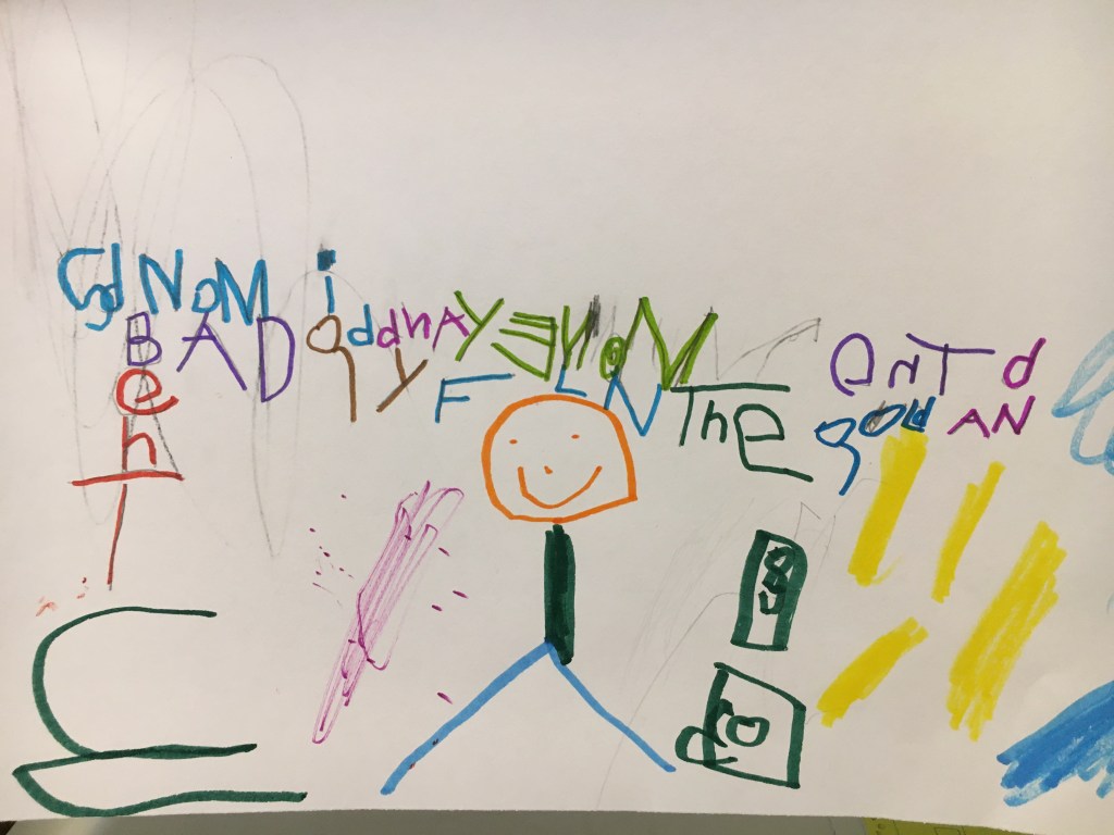 Can you read this (starting with the number 3)? It says, “The bad guy found the gold and the money and diamonds.” Todd started writing from left to right, then did some reversals while writing from left to right. I traced with colored markers to pick out each word better.