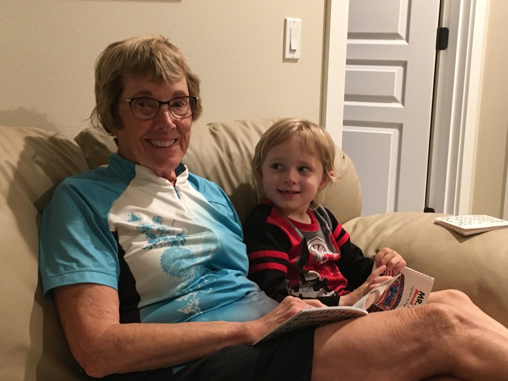 We went back to my parent’s house for dinner and bedtime. Out on the patio, Grandpa read Mr. Topsy Turvy to Todd.