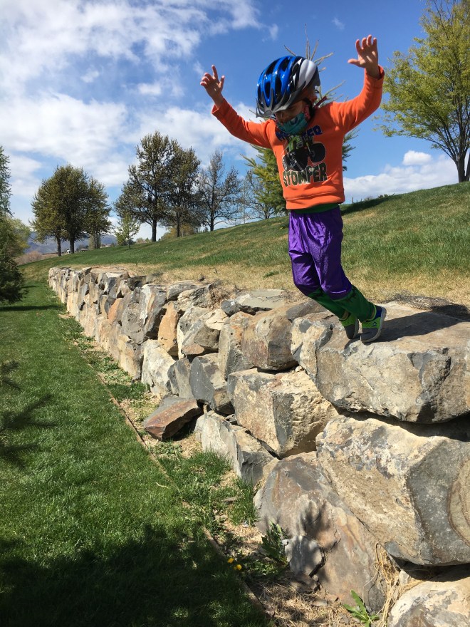 Cashmere pump track (brief spurt of biking but mostly running around); throwing rocks at the river & climbing up the hillside (he was more interested in climbing than throwing rocks)